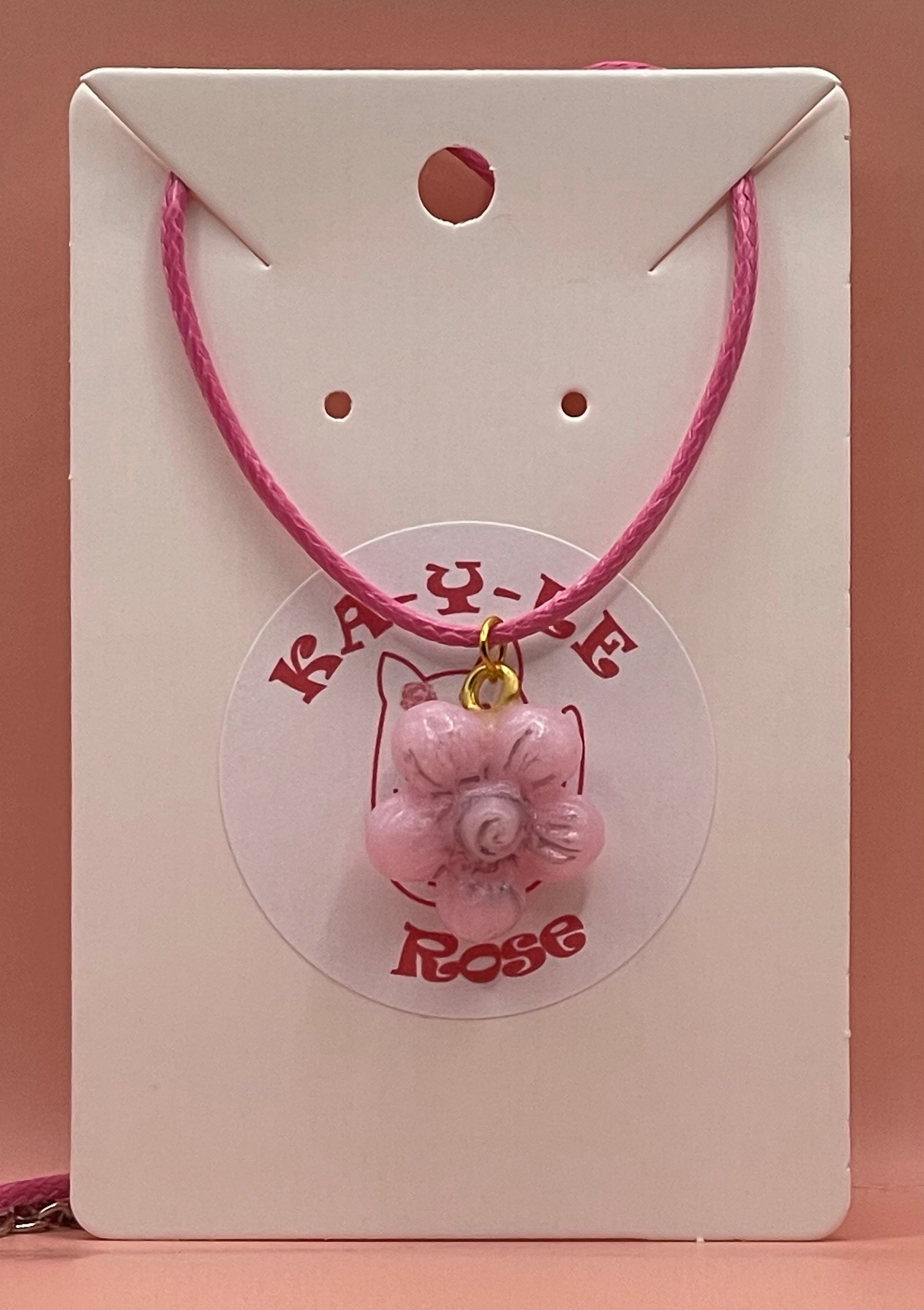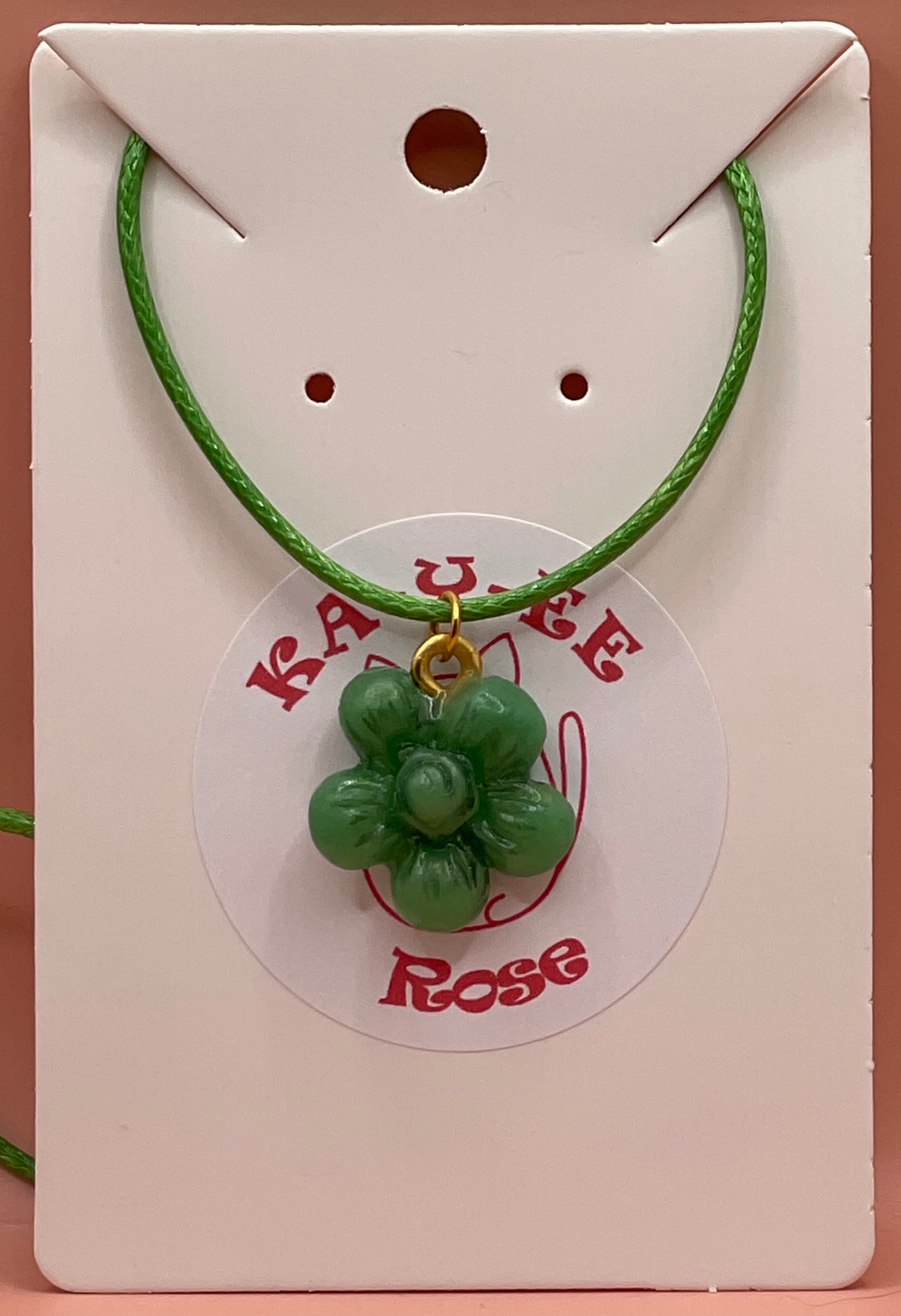 Adorable flower necklace sculpted out of clay on a woven cord necklace.