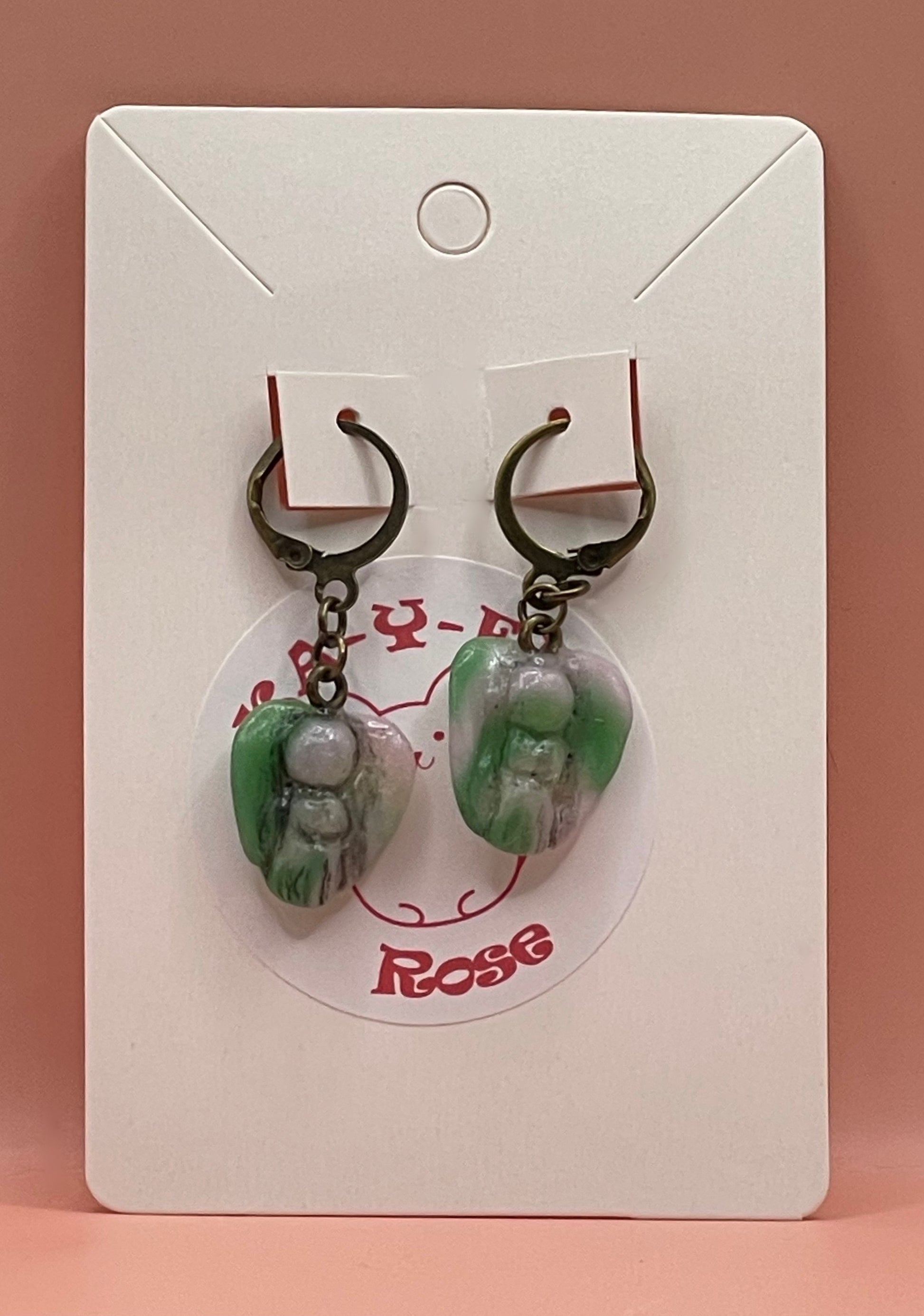 Pretty stone angel earrings carved out of green jade, rose quartz and translucent style clays on gold, silver or bronze plated lever hypoallergenic nickel free back hoops with gold, silver or bronze plated hardware.