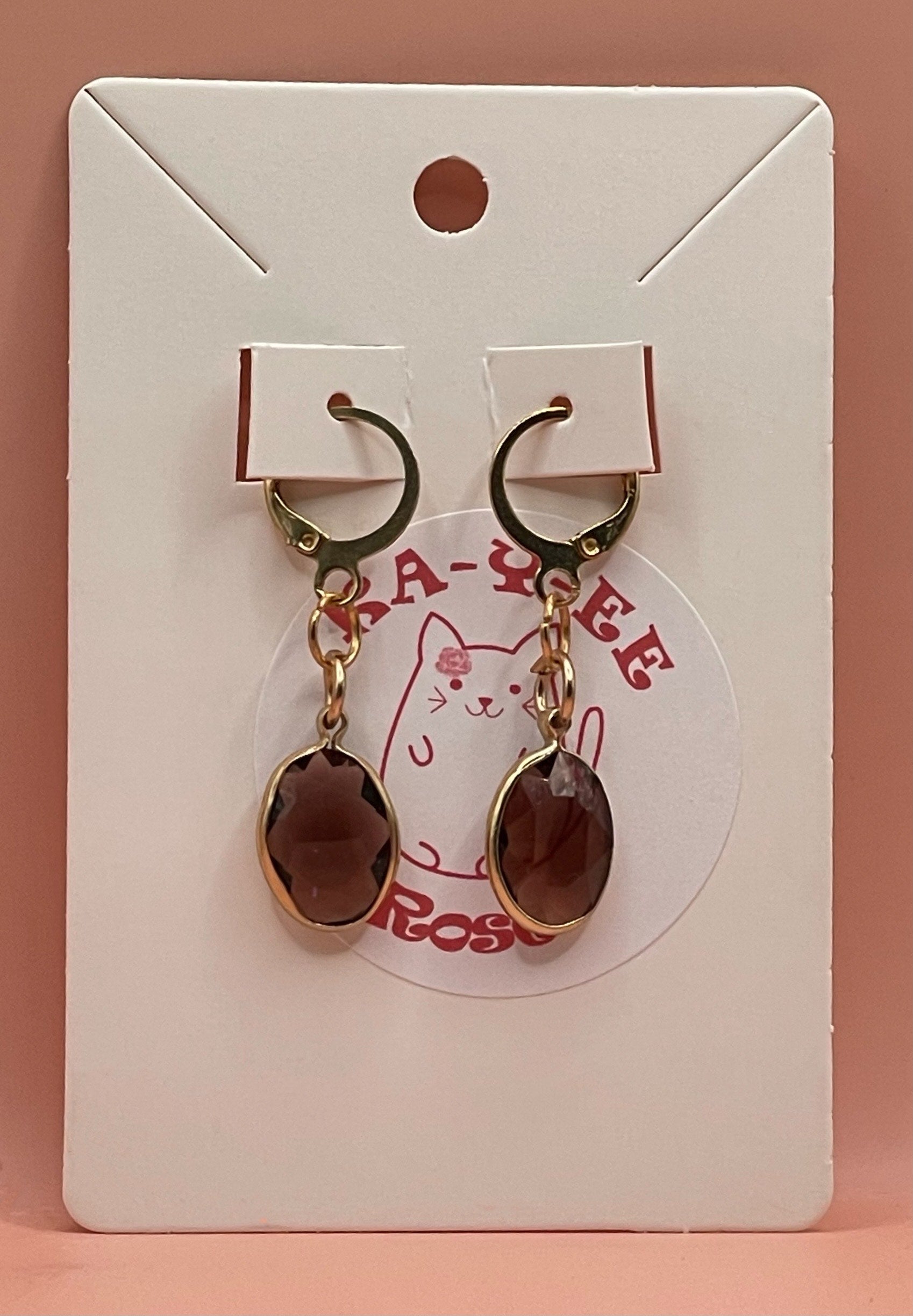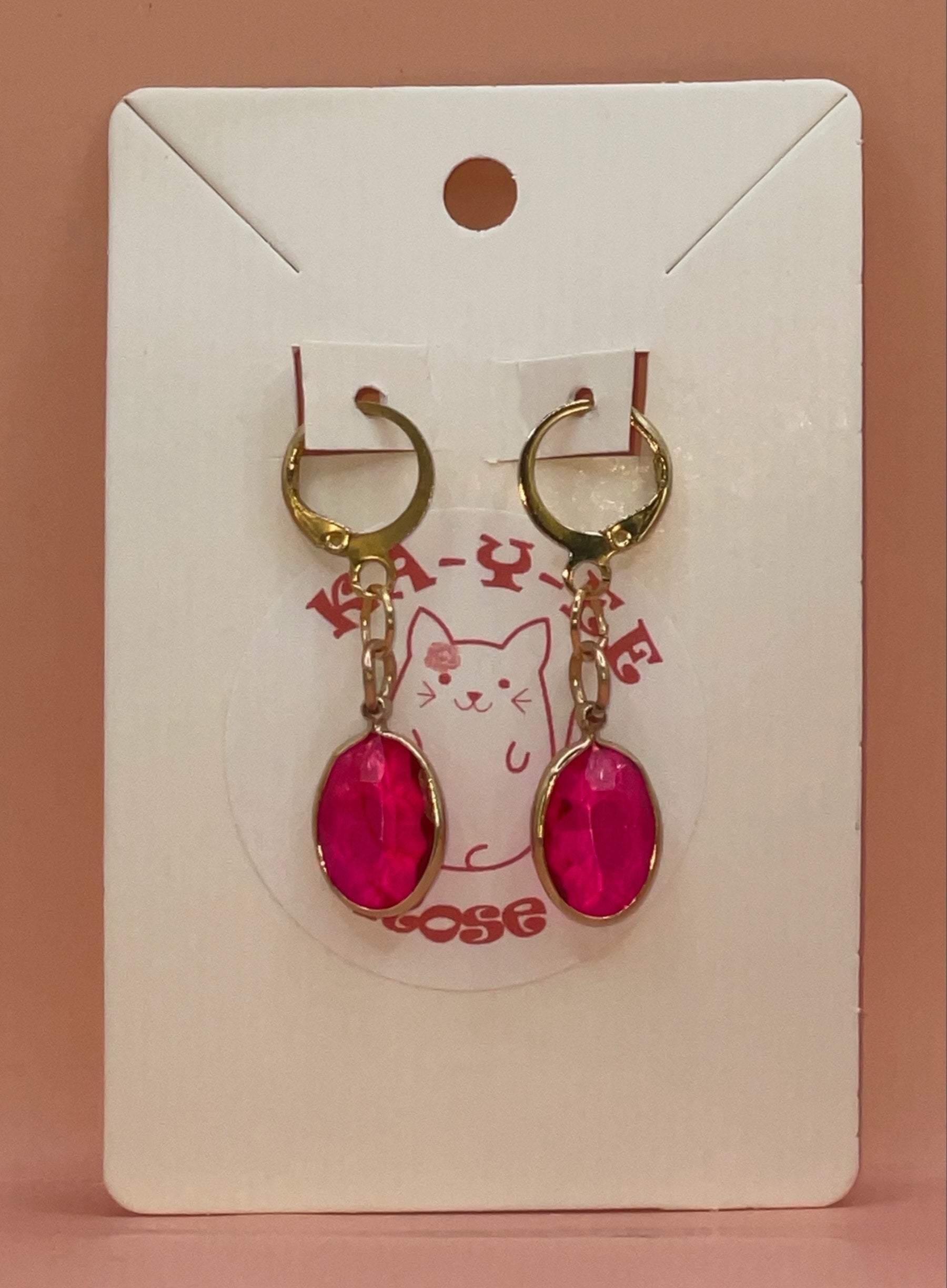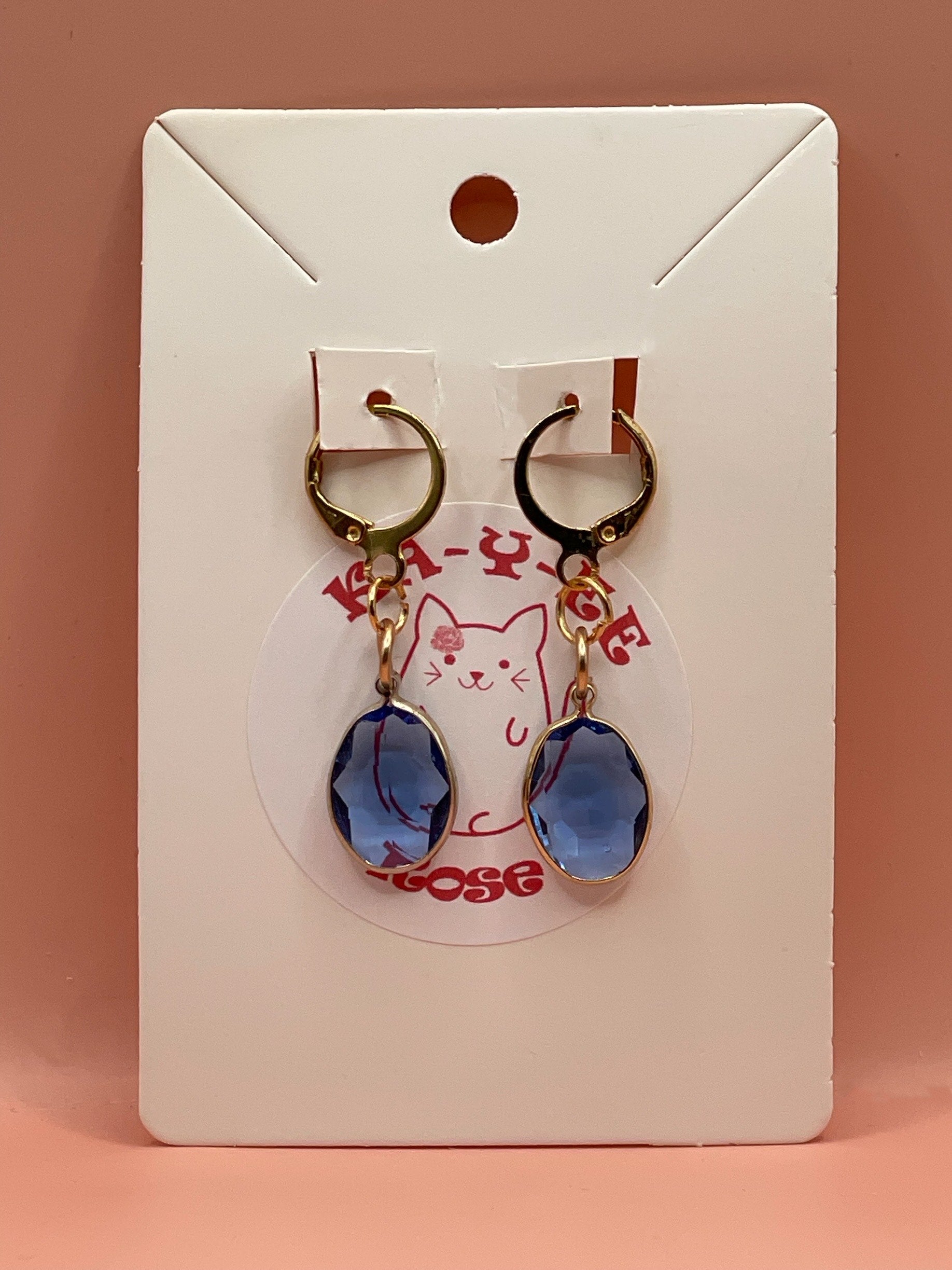 Beautiful oval gems in various colors hanging from gold plated lever hypoallergenic and nickel free hoops with gold plated hardware.