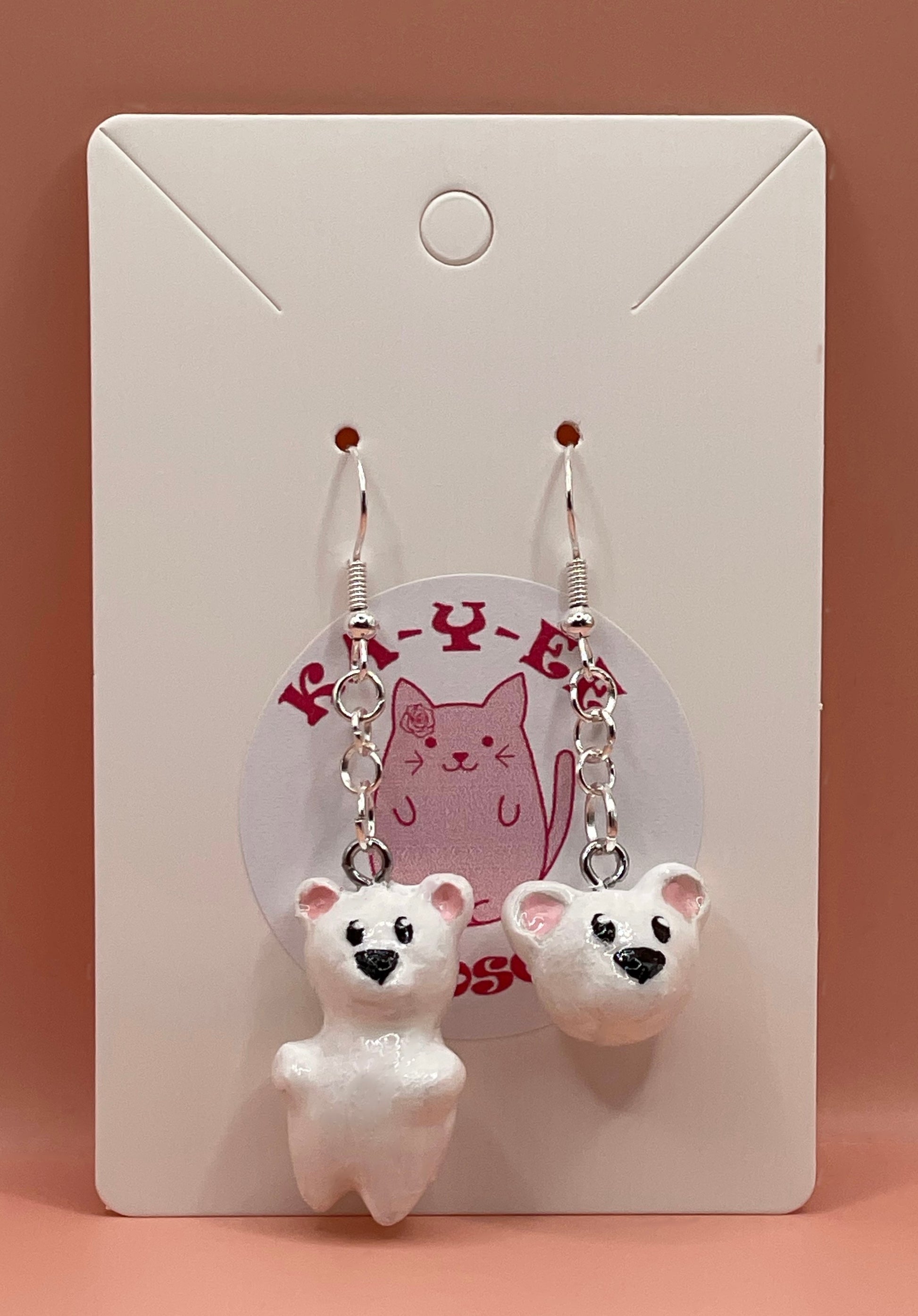 Adorable polar bear earrings hand sculpted from polymer clay available on gold or silver plated hypoallergenic earring hooks with gold or silver plated hardware. These earrings will be part of the merch line for Naomi Rose (TikTok).